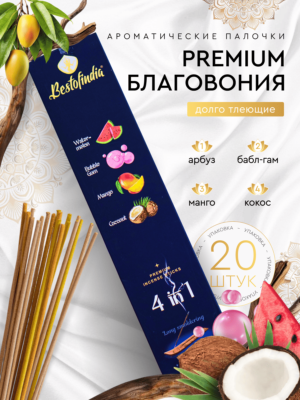 Благовония 4-в-1 (Арбуз, Бабл Гам, Манго, Кокос) с Подставкой Бэст оф Индия 20шт Best of India 4-in-1 (Watermelon, Bubble Gum, Mango, Coconut) Premium Incense Sticks