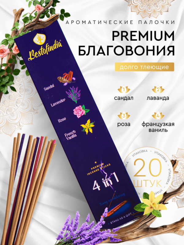 4 IN 1: Sandal, Lavender, Rose, French Vanilla, Bestofindia – это набор из четырех различных ароматов, которые по-разному воздействуют на настроение и уровень энергии человека.