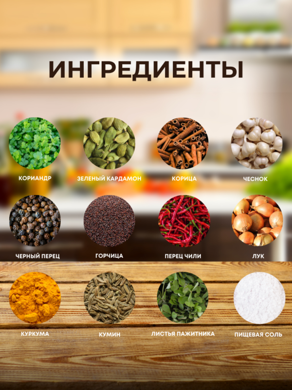Состав: кориандр, куркума, семена пажитника, горчица, кумин, лук, рисовая мука, перец чили, чеснок, соль, черный перец, листья пажитника, корица, зеленый кардамон, лавровый лист.