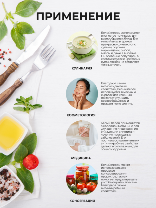 В кулинарии белый перец используется как в целом виде (горошком), так и в молотом.