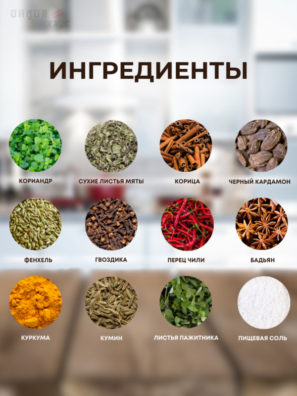 Состав: перец чили, кориандр, корица, соль, гвоздика, листья пажитника, рафинированное хлопковое масло, черный кардамон, бадьян, кумин, фенхель, сухие листья мяты, куркума, лавровый лист.