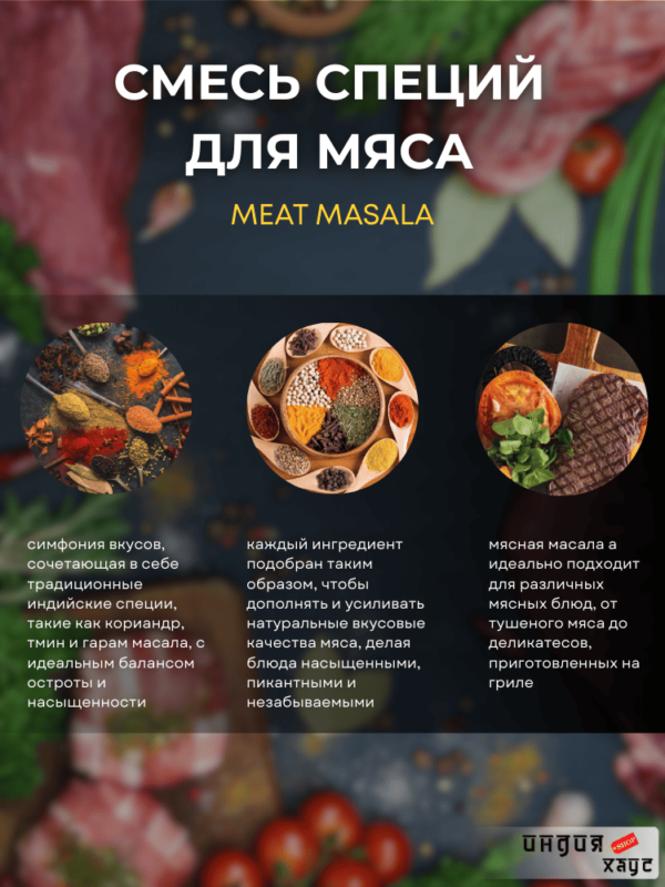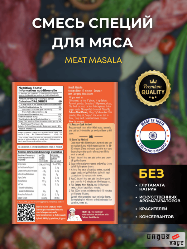 Приправа для мяса Meat Masala содержит только натуральные травы и ингредиенты.