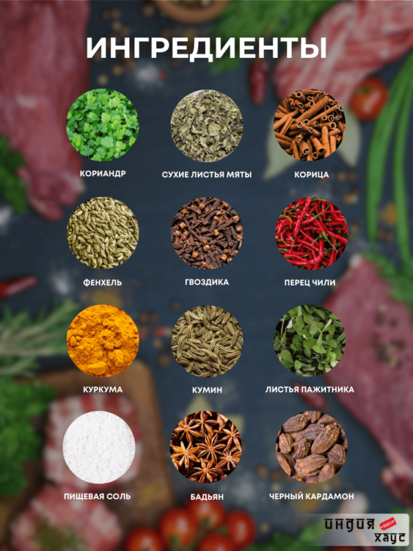 Состав: перец чили, кориандр, корица, соль, гвоздика, листья пажитника, рафинированное хлопковое масло, черный кардамон, бадьян, кумин, фенхель, сухие листья мяты, куркума, лавровый лист.