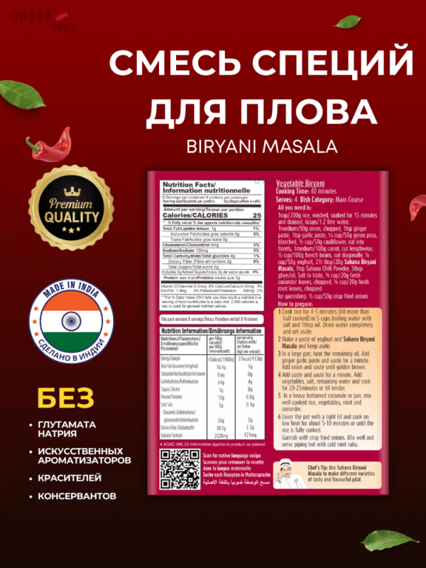 Смесь Biryani Masala – не очень острая. Но если использовать ее в правильной пропорции, то она обязательно добавит любому блюду остроту и вкус.