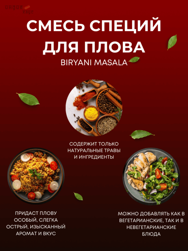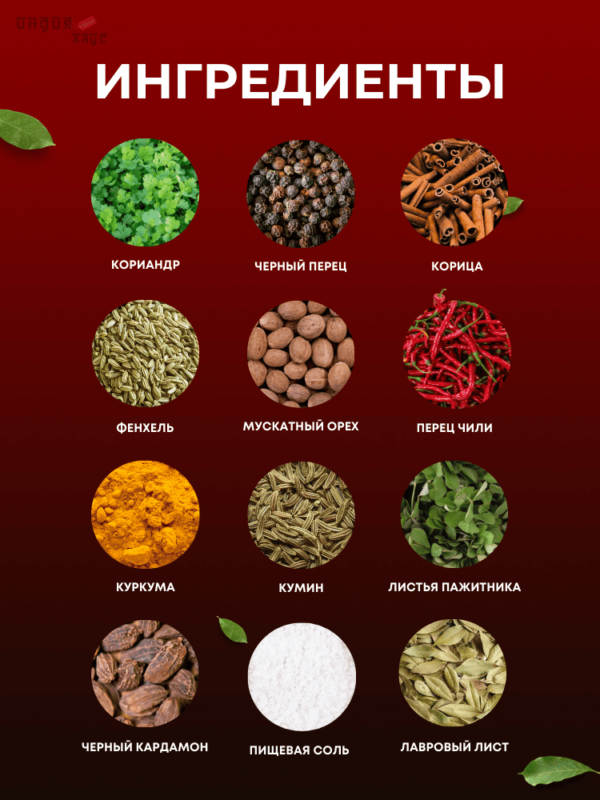 Состав: кориандр, кумин, перец чили, корица, зеленый кардамон, корица, соль, черный перец, куркума, лавровый лист, черный кардамон, фенхель, листья пажитника, мускатный орех, мускатный цвет.