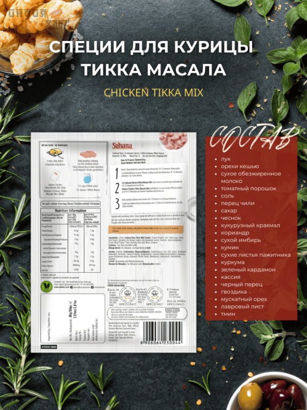 Состав: лук, кешью, сухое молоко, томат порошок, соль поваренная, перец чили, сахар, чеснок, кукурузный крахмал, кориандр, имбирь, тмин, сухие листья пажитника, куркума, зеленый кардамон, кора кассии (тадж), черный перец, паприка, гвоздика, мускатный орех, лавровый лист, мускатный цвет, тмин.