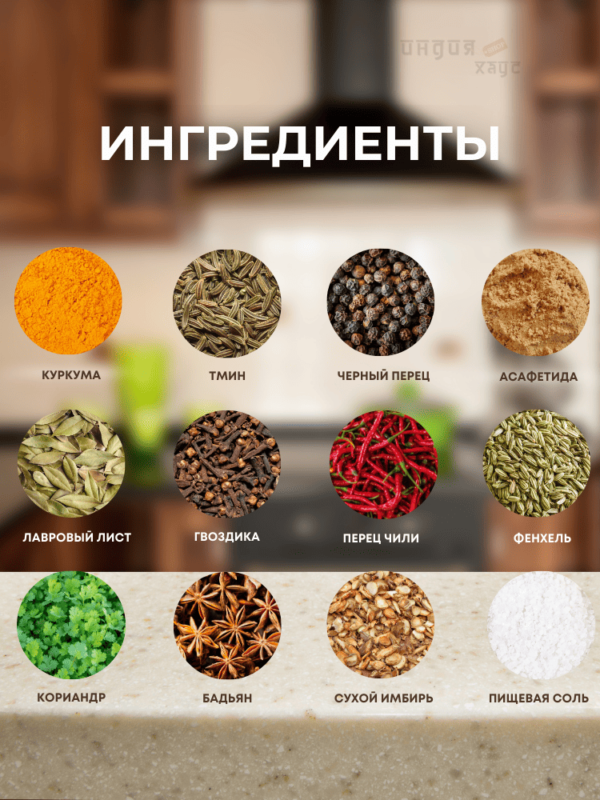 Ингредиенты: Кориандр, тмин, перец чили, пищевая соль, лавровый лист, гвоздика, черный перец, куркума, фенхель, бадьян, трифалла, сухой имбирь, асафетида.