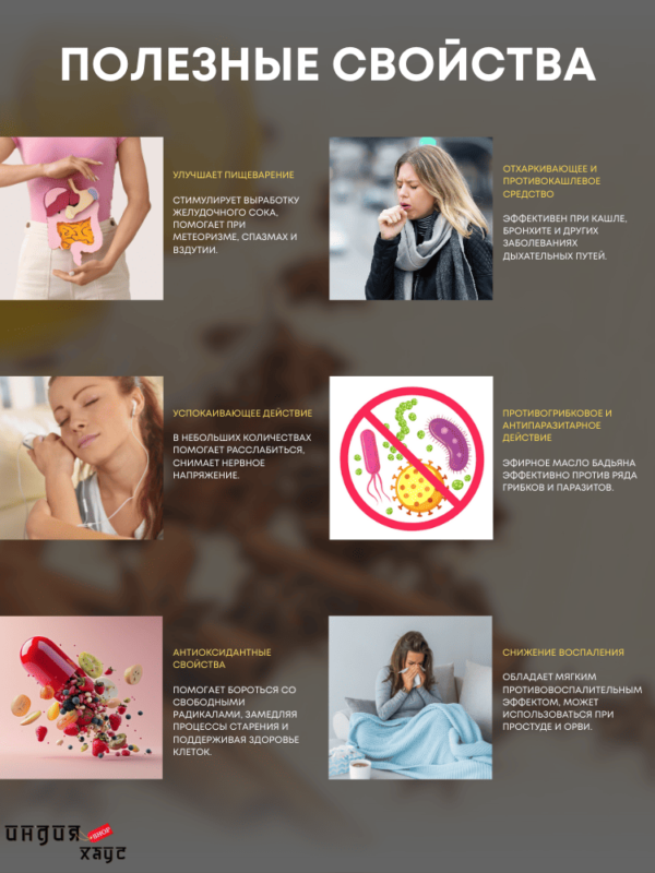 Анис — традиционный компонент средств от кашля и других заболеваний органов дыхания. Он обладает отхаркивающими свойствами, помогает быстрее выводить мокроту, облегчает приступы астмы.