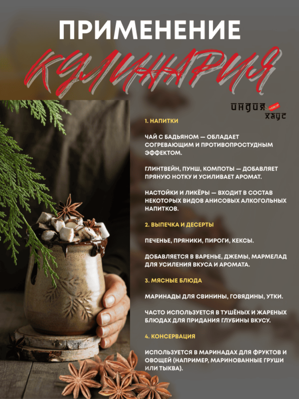 Придает тонкий аромат всем видам выпечки, курице, свинине, а также супам, соусам, пуншу и ликерам.