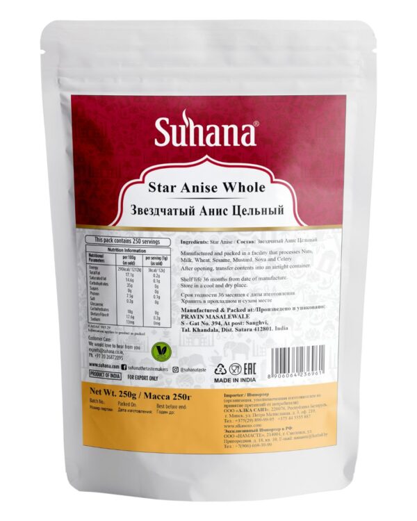 Звездчатый анис (бадьян) Suhana придает блюдам сладковатый, пряный вкус, напоминающий вкус лакрицы.