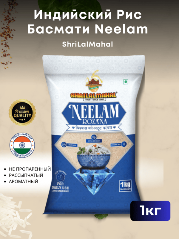 Рис Басмати Нилам считается королем среди всех сортов риса. Его зернышки длиной в среднем 6.5-8 мм во время варки увеличиваются в длину до 20-22 мм, а не в ширину, оставаясь рассыпчатыми. А сорт Нилам может увеличиваться до 3-4 раз!