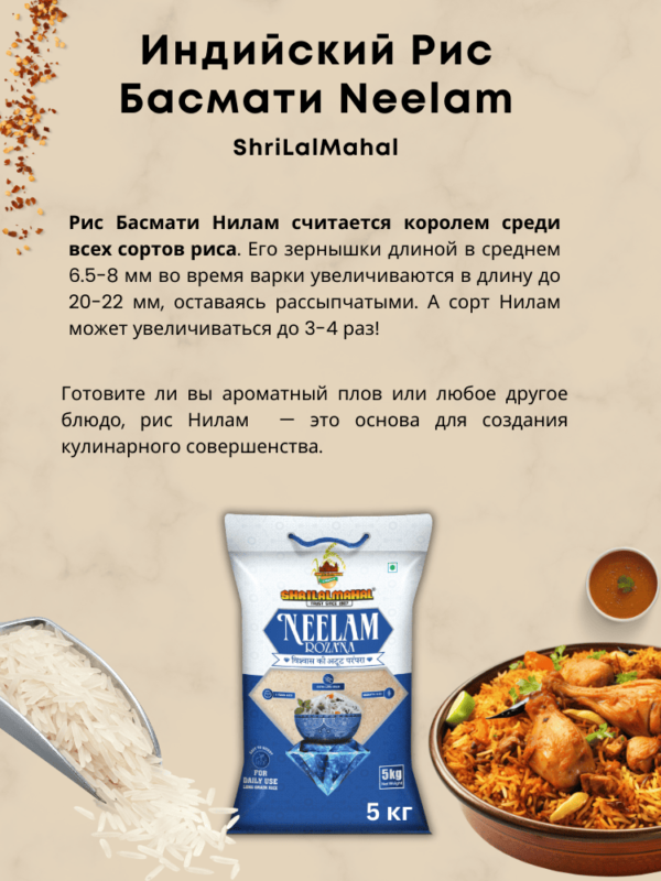 Рис Басмати Нилам считается королем среди всех сортов риса. Его зернышки длиной в среднем 6.5-8 мм во время варки увеличиваются в длину до 20-22 мм, а не в ширину, оставаясь рассыпчатыми. А сорт Нилам может увеличиваться до 3-4 раз!