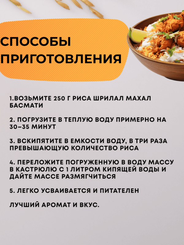 Восхитительный вкус риса басмати Supreme делает его выбором для всех блюд. Он особенно подходит для приготовления пулао и бириани.