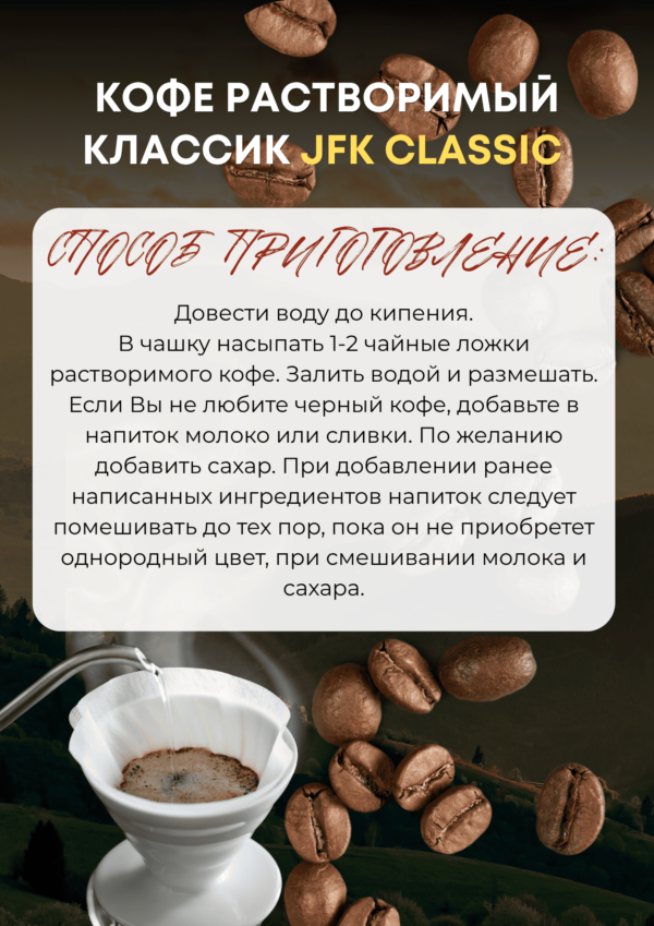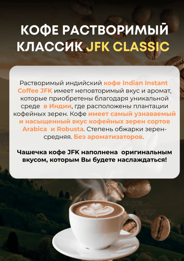 Растворимый индийский кофе Indian Instant Coffee JFK- имеет неповторимый вкус и аромат, которые приобретены благодаря уникальной среде в Индии, где расположены плантации кофейных зерен.