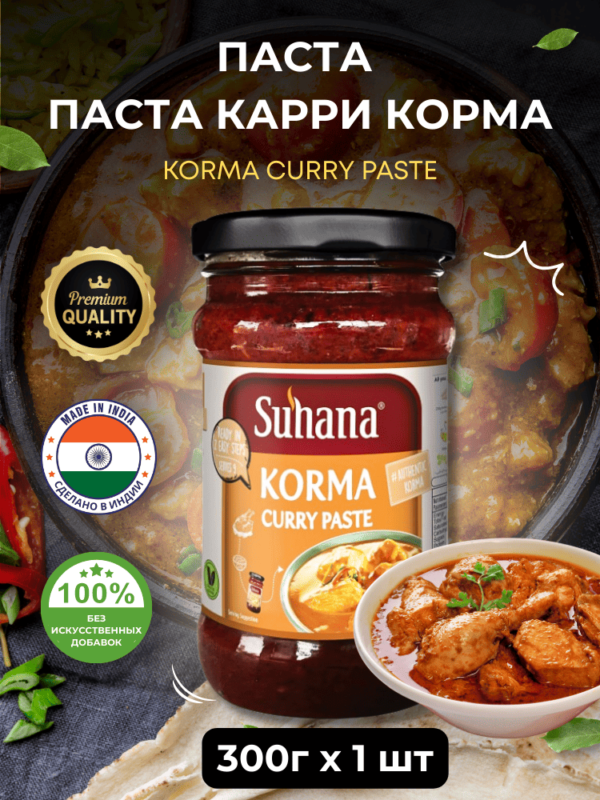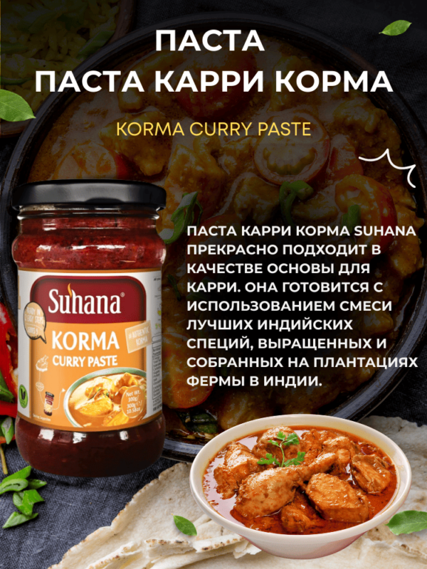 Паста Карри Корма Suhana прекрасно подходит в качестве основы для карри. Она готовится с использованием смеси лучших индийских специй, выращенных и собранных на плантациях фермы в Индии.