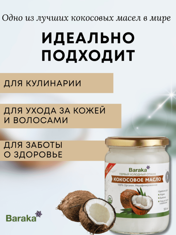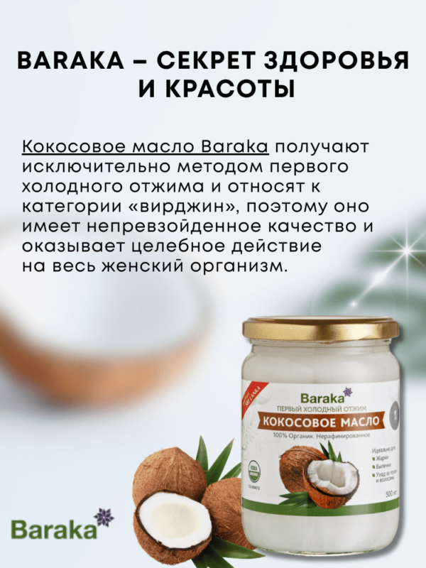 Кокосовое масло нерафинированное Baraka получают исключительно методом первого холодного отжима и относят к категории «вирджин», поэтому оно имеет непревзойденное качество и оказывает целебное действие на весь женский организм.