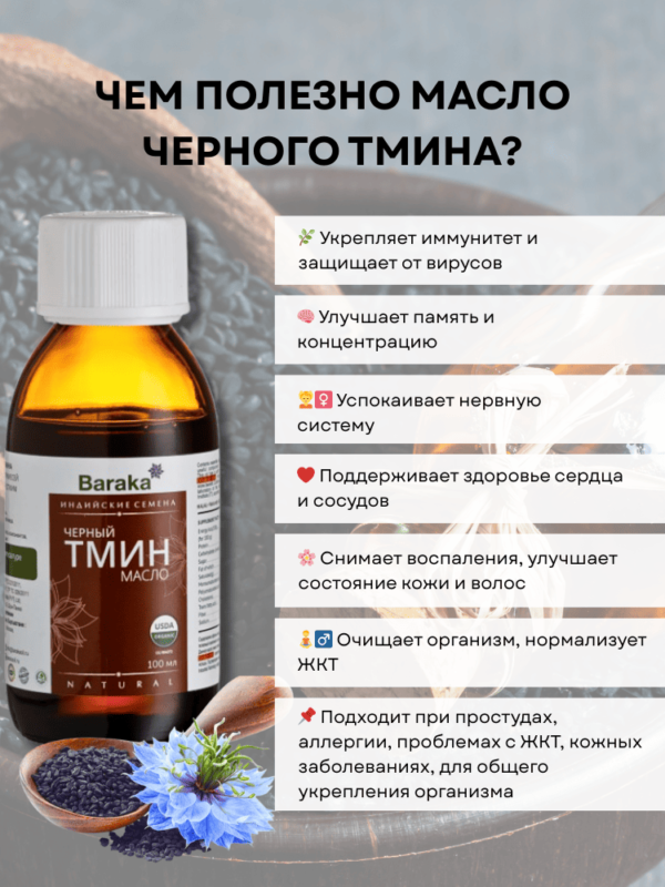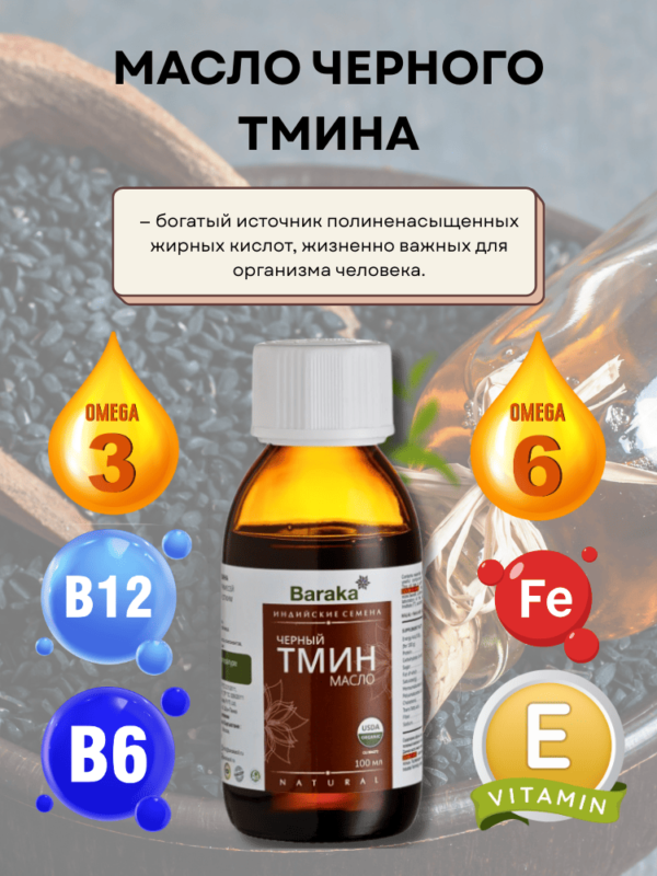 Масло черного тмина Baraka − это в первую очередь богатый источник полиненасыщенных жирных кислот, жизненно важных для организма человека. В отличие от других производителей, компания «Барака» выпускает этот продукт только из семян черного тмина, имеющих Органик сертификат. Масло получают путем холодного отжима, что позволяет сохранять все полезные свойства черного тмина. Вы всегда сможете заказать у нас целебное масло.