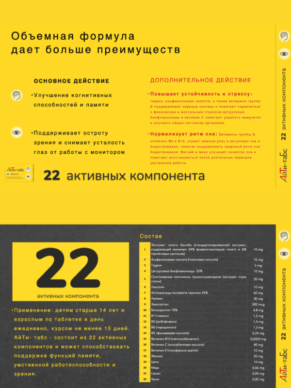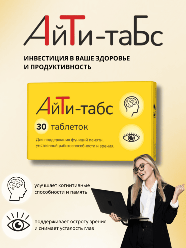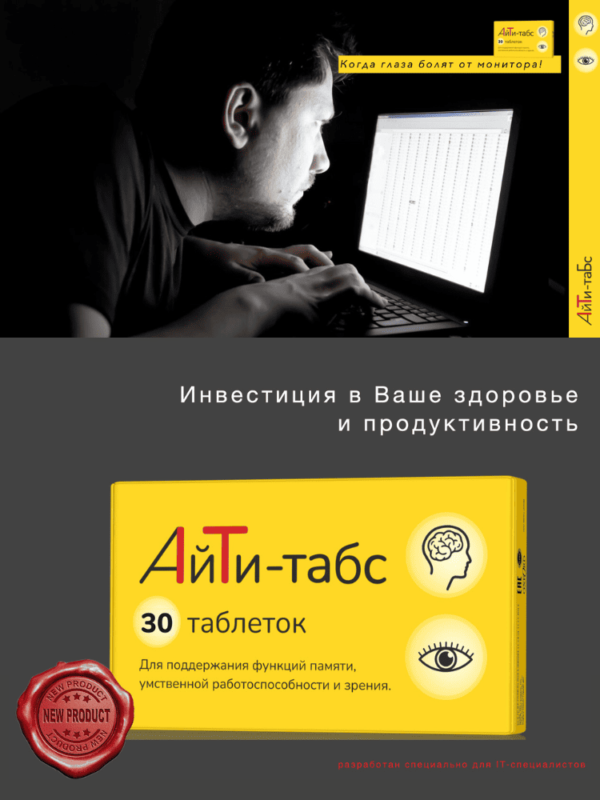Инновационный витаминный комплекс АйТи-таБс разработан специально для людей, работающих за компьютером и специалистов, чья работа требует высокой умственной концентрации и зрительного напряжения.