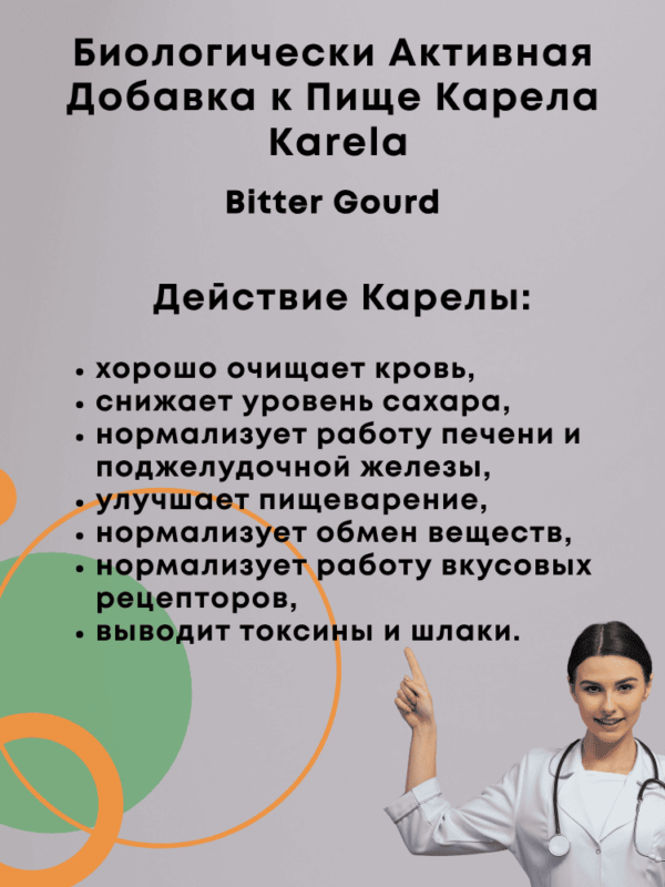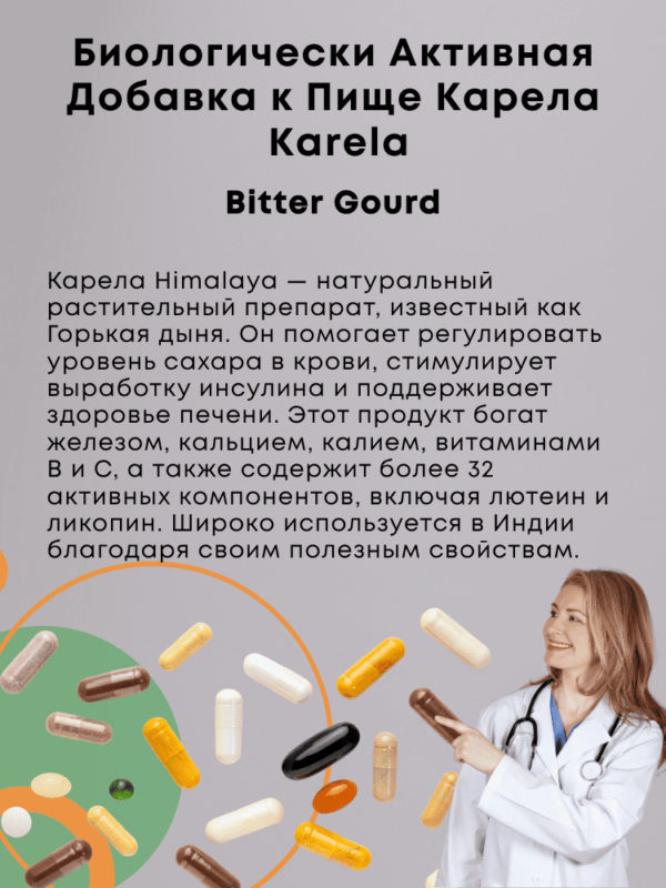 Карела Himalaya — натуральный растительный препарат Карела или Горькая дыня регулирует уровень сахара в крови и моче. Карела активно используется в Индии. Очень богата железом, бета-каротином, кальцием, калием, витаминами С, В1, В2, В3, фосфором. Нормализует работу печени, содержит полипептиды схожие с инсулином, стимулирует выработку инсулина.