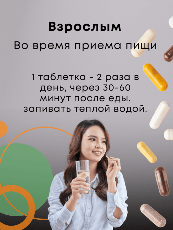 Способ применения: 1 таблетка — 2 раза в день, через 30-60 минут после еды, запивать теплой водой.