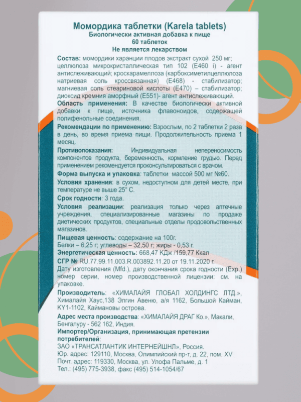 Состав: Каждая таблетка содержит: 250 мг karavella (Momordica charantia).