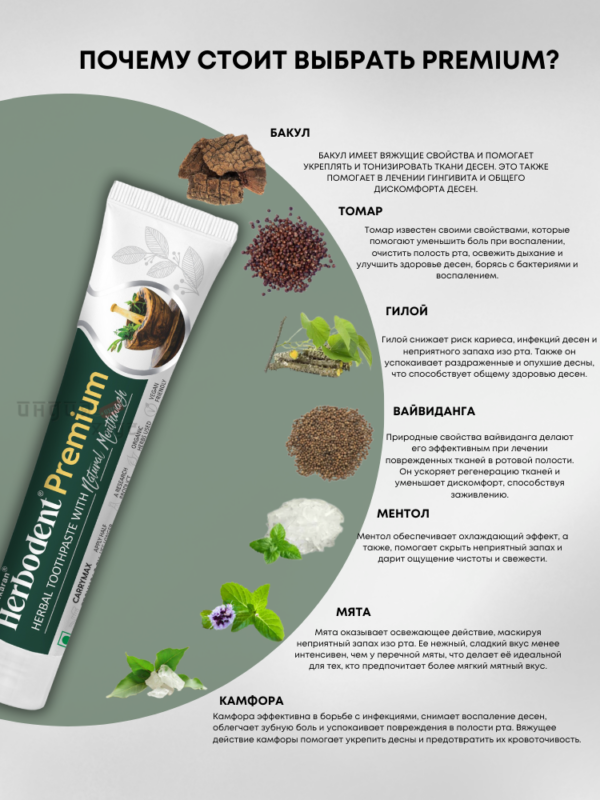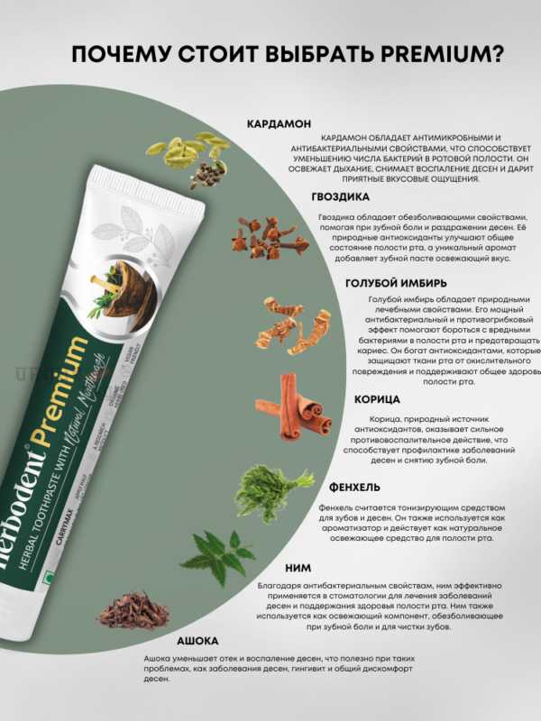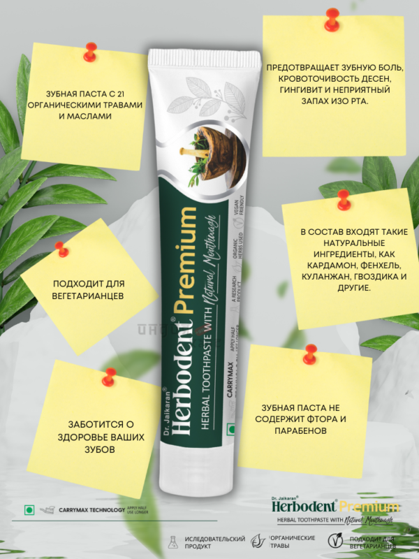 Паста имеет приятный натуральный вкус гвоздики с нотками кардамона и нима — такое сочетание позволит долгое время сохранить свежее дыхание, а так же защитит ваши зубы от пиореи, предотвратит кровоточивость и даже снизит чувствительность. Зубная паста Herbodent состоит не только из букета редких и полезных трав, но и из фруктов. Это уникальное средство гигиены для полости рта не имеет никаких аналогов – паста изготовлена по древнейшим рецептам, исходя из аюрведических формул, над которыми трудились наши предки.