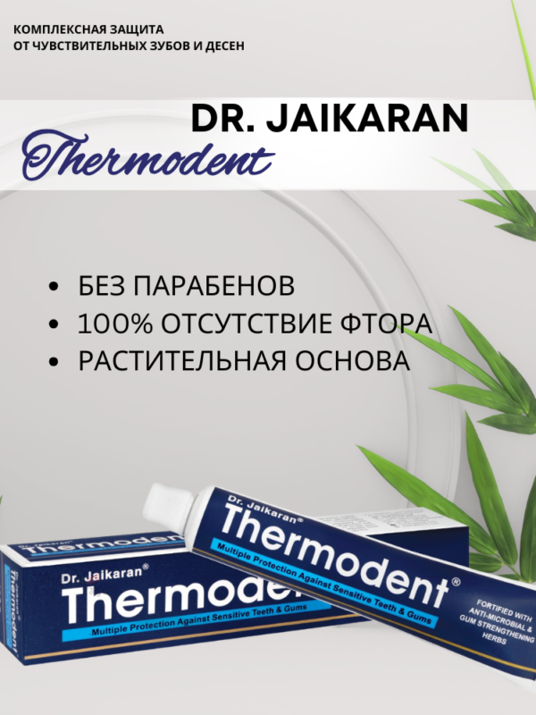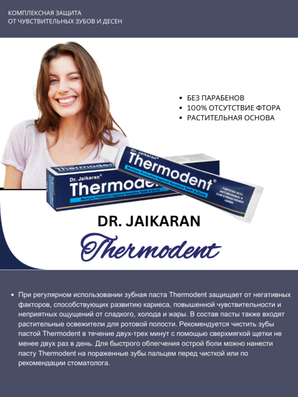 Зубная паста Thermodent укрепляет эмаль и создает надежный барьер, защищая чувствительные зубы от неприятных ощущений при употреблении горячей и холодной пищи или сладкого.