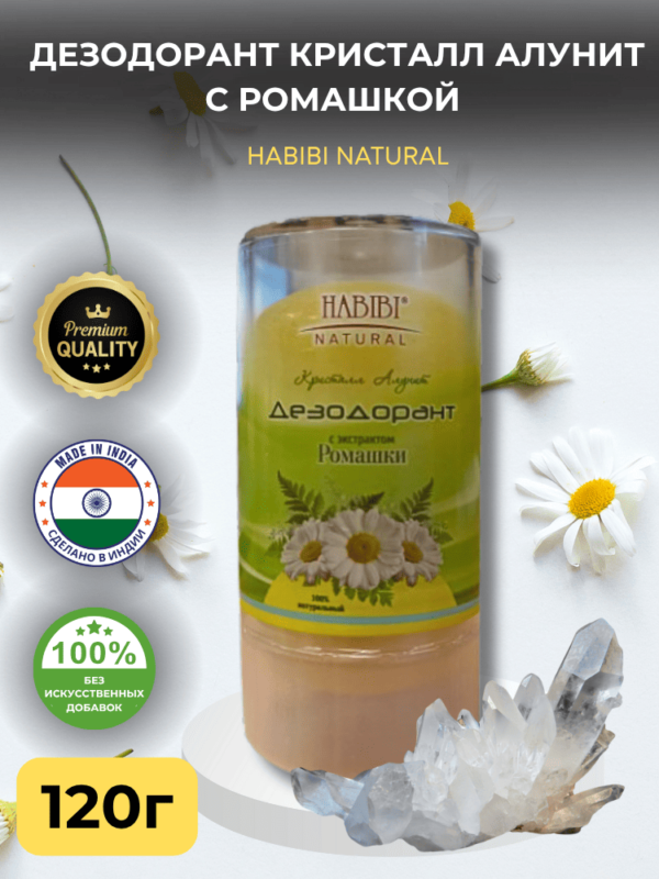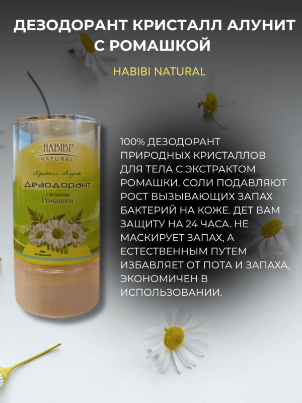 100% дезодорант природных кристаллов для тела с экстрактом ромашки. Соли подавляют рост вызывающих запах бактерий на коже. Дет Вам защиту на 24 часа. Не маскирует запах, а естественным путем избавляет от пота и запаха, экономичен в использовании.