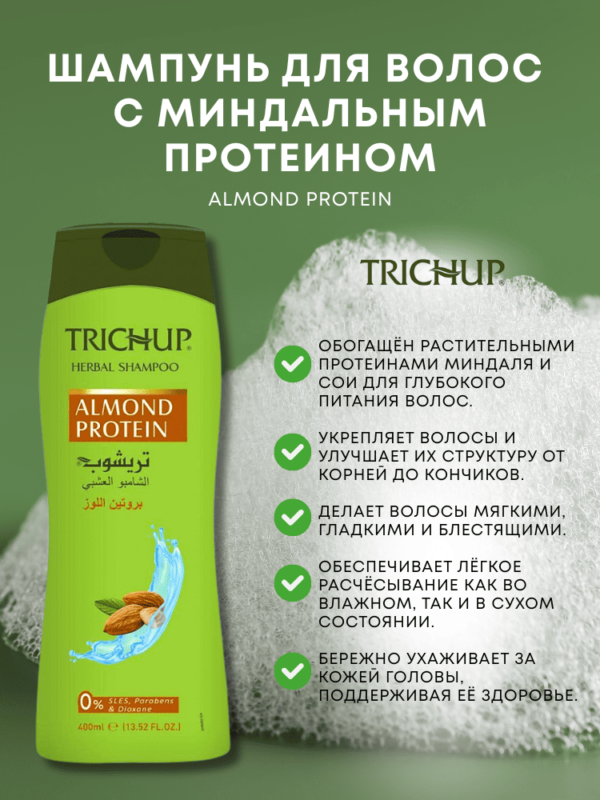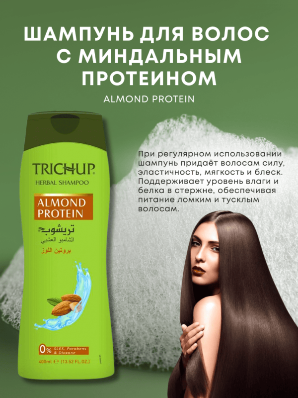 Шампунь c Миндальным Протеином Almond Protein — эффективное средство для ухода за волосами и кожей головы, обогащённое протеинами растительного происхождения из сладкого миндаля и сои. Содержит в себе кондиционеры для глубокого питания волос во время мытья. Предотвращает спутывание волос при расчёсывании как во влажном состоянии, так и в высушенном.